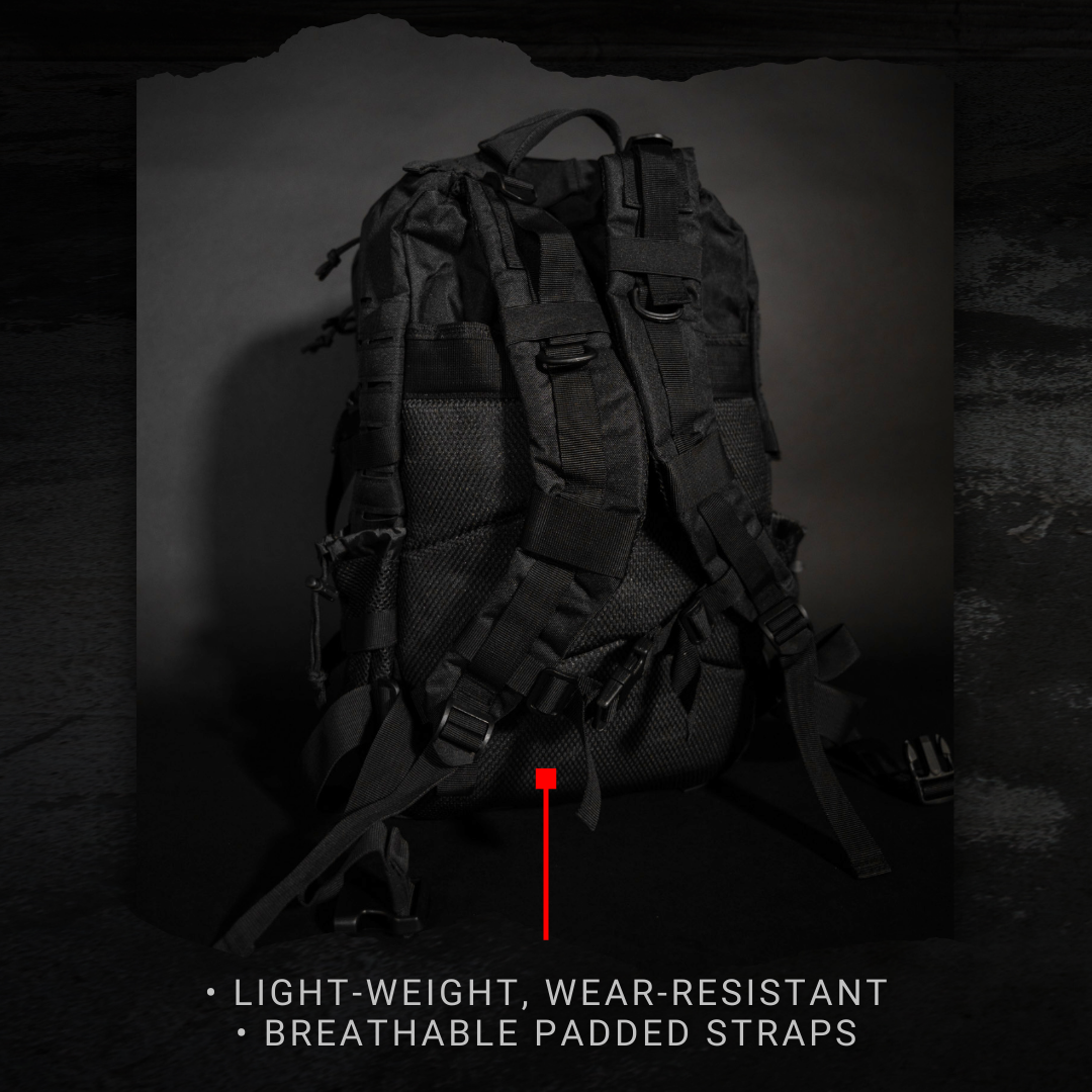 This tactical backpack comes with adjustable padded shoulder straps for comfortable carrying and a sternum strap for further stability. The shoulder straps and back area are padded with mesh to provide comfort, breathability, and strength while traveling.